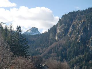 Je rentre dans le torrent et tout à coup mes deux rennes se cassent, croyez vous que Nestellios aurait traversé d’instinct le torrent ? He non ! Sans doute avait il en tête de fuir au plus vite et de s’éloigner le plus possible de la grosse masse grise qu’on ne quittait pas des yeux. N’étant plus maitre des commandes je sautais dans l’eau claire en ce beau mois de novembre, charmé par ces belles montagnes aux sommets enneigées, de l’eau jusqu’à la taille je gagnais la berge opposée mais le remblai était infranchissable malgré les tentatives de Nestellios.